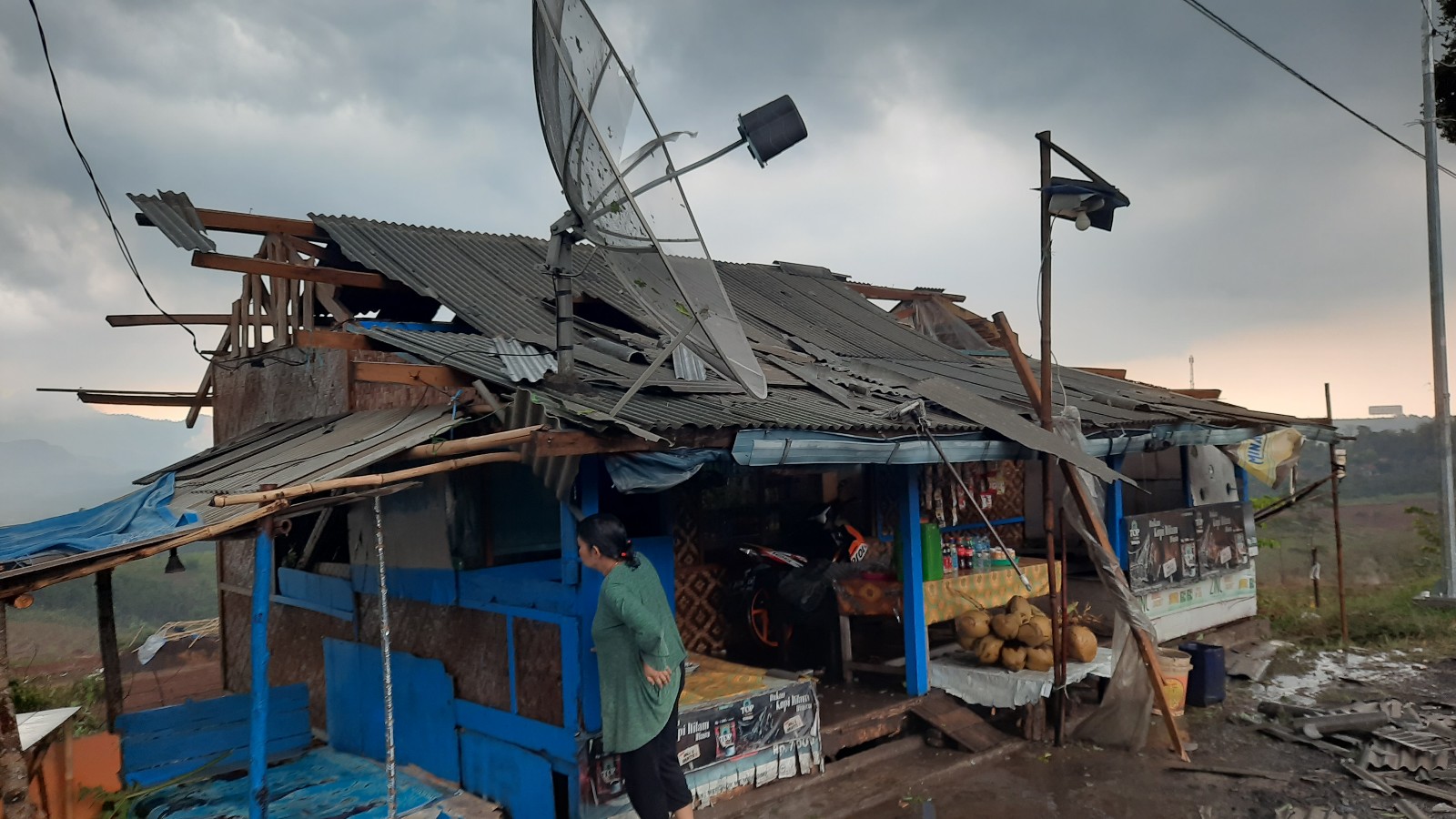 “Atap warung saya rusak. Barang-barang di dalam juga ikut tertimpa bangunan. Alhamdulillah masih selamat, tidak ada korban jiwa,” ujar dia.